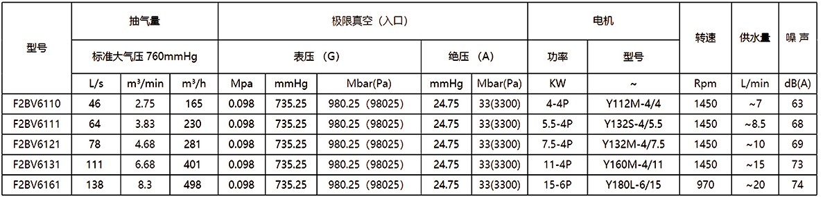 2.上列性能基于進氣溫度20℃,進水溫度15℃,排氣壓力1013hpa的條件,被吸入氣體為飽和空氣。(飽和空氣是指在對應吸入狀態下,其相對濕度為100%的濕空氣。)3.抽氣速率、軸功率性能允差10%。