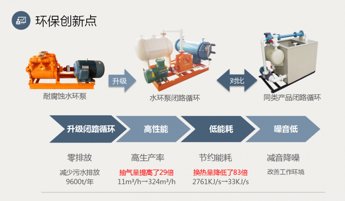 6、環(huán)保性能優(yōu)越—真空泵工作液可循環(huán)使用,耗水量低至不銹鋼同類產(chǎn)品的1%,可有效減少污染及其治理費用,降低運行成本。廢氣密閉輸送至回收處理系統(tǒng),杜絕廢水廢氣跑冒滴漏;